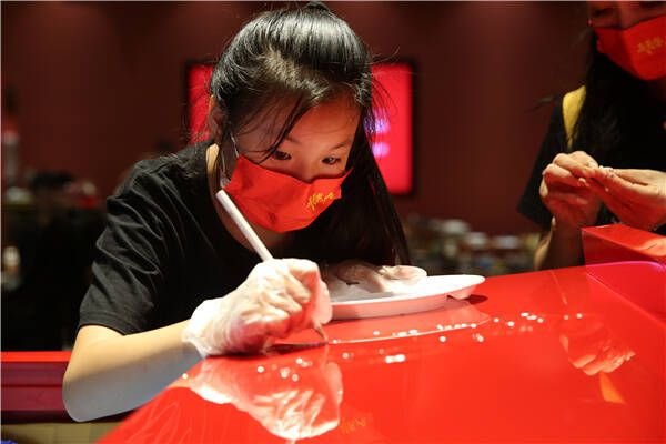白色三角钢琴上,艺术家们以鲜花为主题创作的作品《百花齐放》,展现出中华民族生生不息的光影和神韵;红色三角钢琴上,以仙鹤祥云为主题创作的作品《鹤寿延年》,表达了对中国共产党成立100周年的美好祝福。
