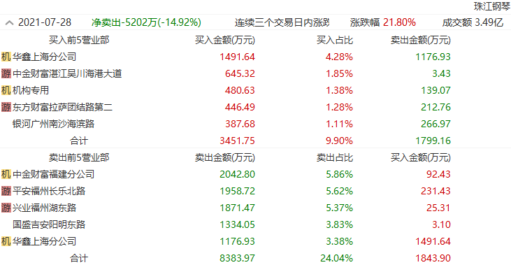 7月28日,珠江钢琴因三日涨幅超27%登上龙虎榜,本周前三个交易日,知名游资华鑫证券上海分公司、机构资金、“拉萨天团”团结路第二营业部均入场抢筹。