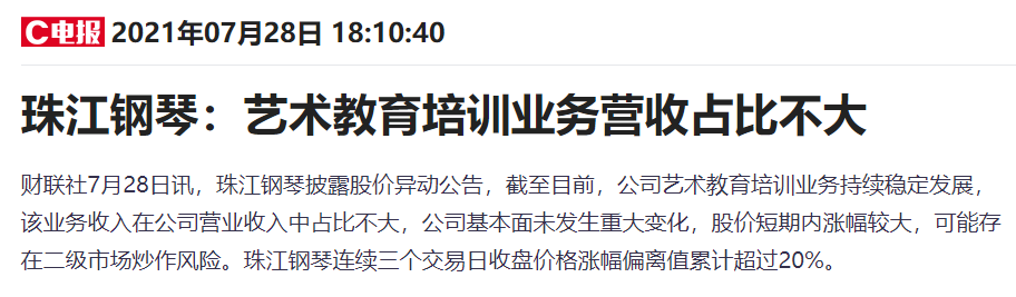 期间虽然珠江钢琴发布公告,称艺术教育培训业务营收占比不大,仍未挡住资金面的热情。