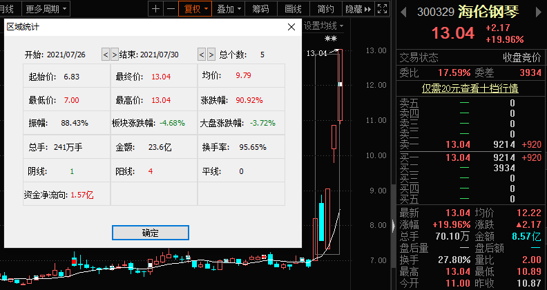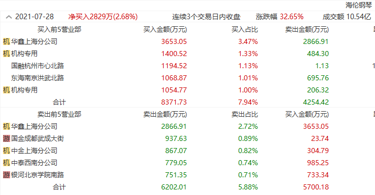 而海伦钢琴也因同样原因登上龙虎榜。华鑫证券上海分公司再度现身榜单,买入786万元;机构资金净买入1765万元。值得注意的是,苏南帮两知名营业部也现身龙虎榜,东海证券南京洪武北路买入373万元,中国银河(601881,股吧)北京学院南路卖出18万元。