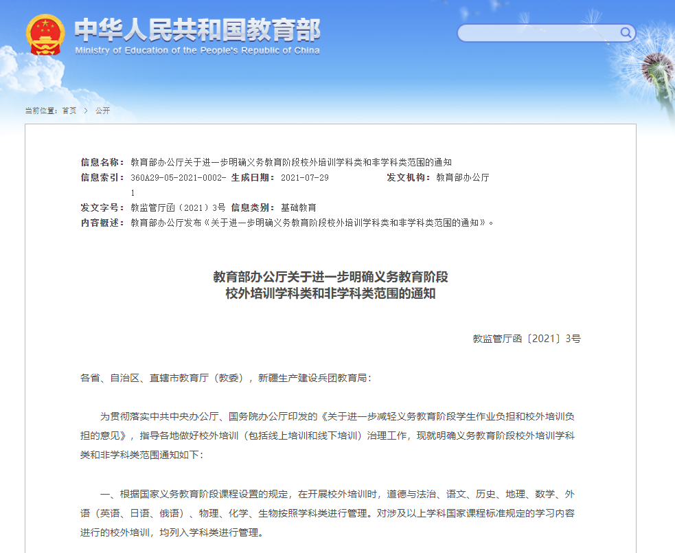 今日,教育部办公厅发布了关于进一步明确义务教育阶段校外培训学科类和非学科类范围的通知。文件写明,包括道德与法治、语文、历史、地理、数学、外语、物理、化学、生物在内的国家义务教育阶段课程均在按照学科类进行管理的范围之内。