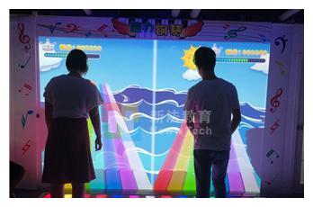 通过多种高新技术,让学生体验在大型地面琴键上演奏钢琴曲的奇妙互动。系统投影大屏上方会落下音符,学生通过音符位置踩踏地面对应的音符琴键,从而完成整首乐曲的演奏。让不懂乐理的学生也能轻松演奏完整的曲目,并对音符有一定基础的理解。这种“游戏化、互动化、智能化”的音乐教学模式,让音乐课堂气氛活跃、好玩,课堂教学效果更有效。