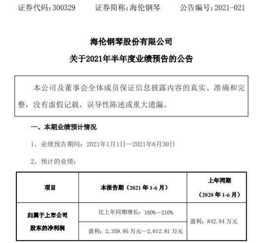 挖贝网7月14日,海伦钢琴(300329,股吧)(300329)近日发布2021年半年度业绩预告,预计业绩同向上升。报告期内归属于上市公司股东的净利润2,359.95万元—2,612.81万元,比上年同期增长180%—210%。