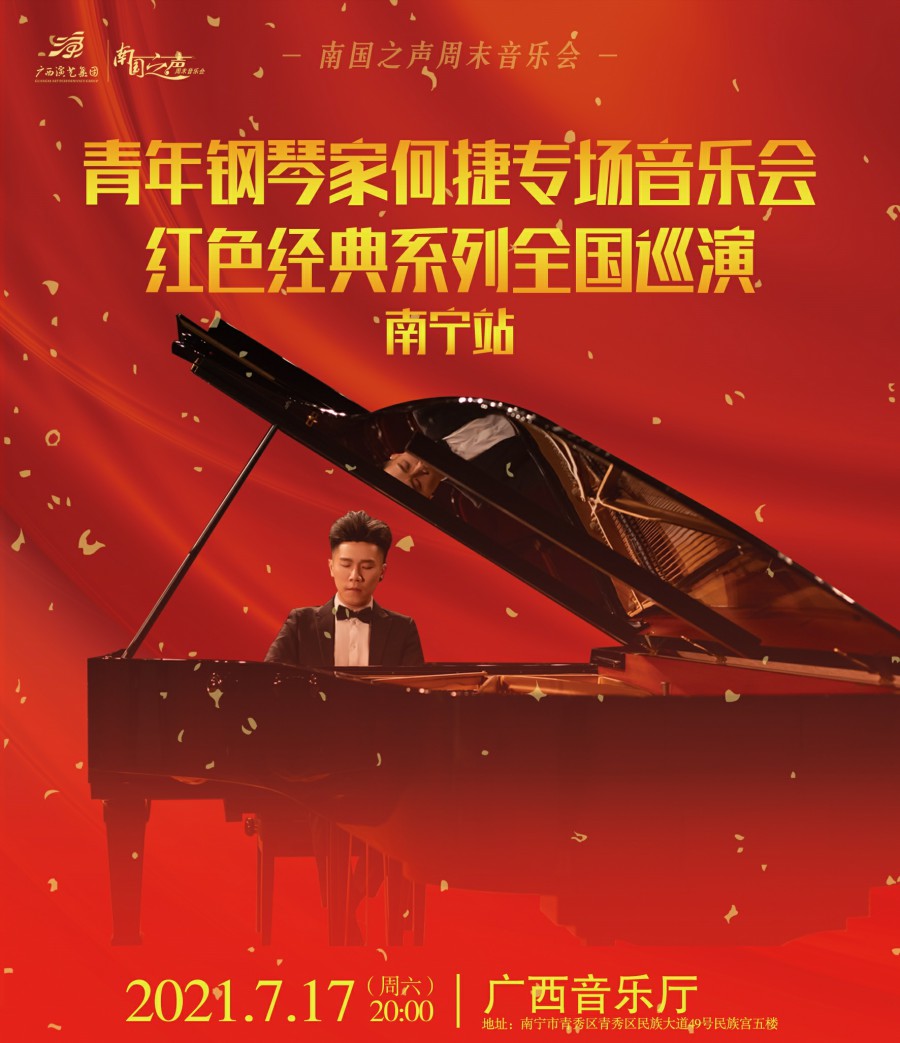 来自四川音乐学院的青年钢琴家何捷将于7月17日在广西南宁音乐厅举办他全国巡演的首场演出,首场音乐会上何捷将为南宁的观众献上他精心准备的《长江之歌》、《唱支山歌给党听》、《太阳最红毛主席最亲》、《映山红》、《红梅赞》、《我的祖国》、《梁祝》、《我爱你中国》、钢琴协奏曲《黄河》、《拉赫玛尼诺夫g小调前奏曲》、《肖邦降b小调夜曲》、《西班牙狂想曲》、《匈牙利狂想曲》等十多首中外经典钢琴名曲。